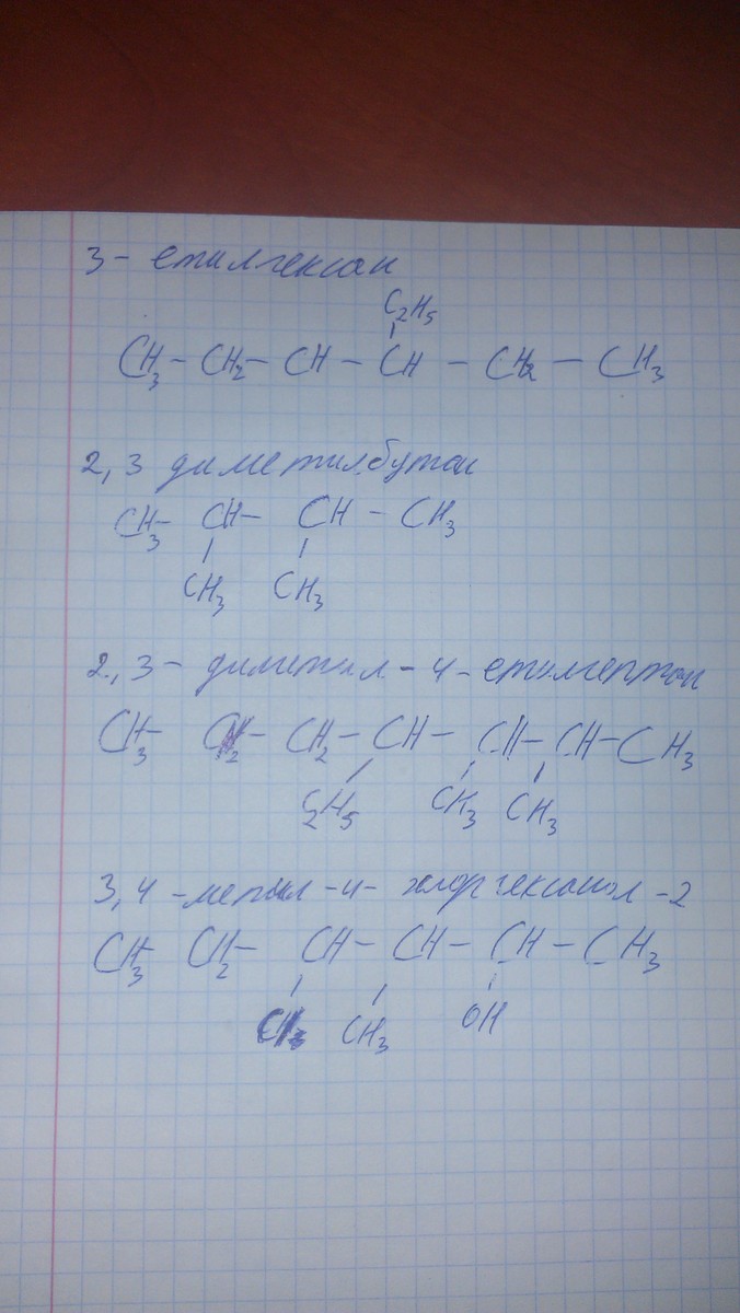 a) 3-этилпгексан, б) 2, 3-диметилбутан в) 2,3-диметил-4-этилгептан, г) 3-метил-4-хлоргексанол-2