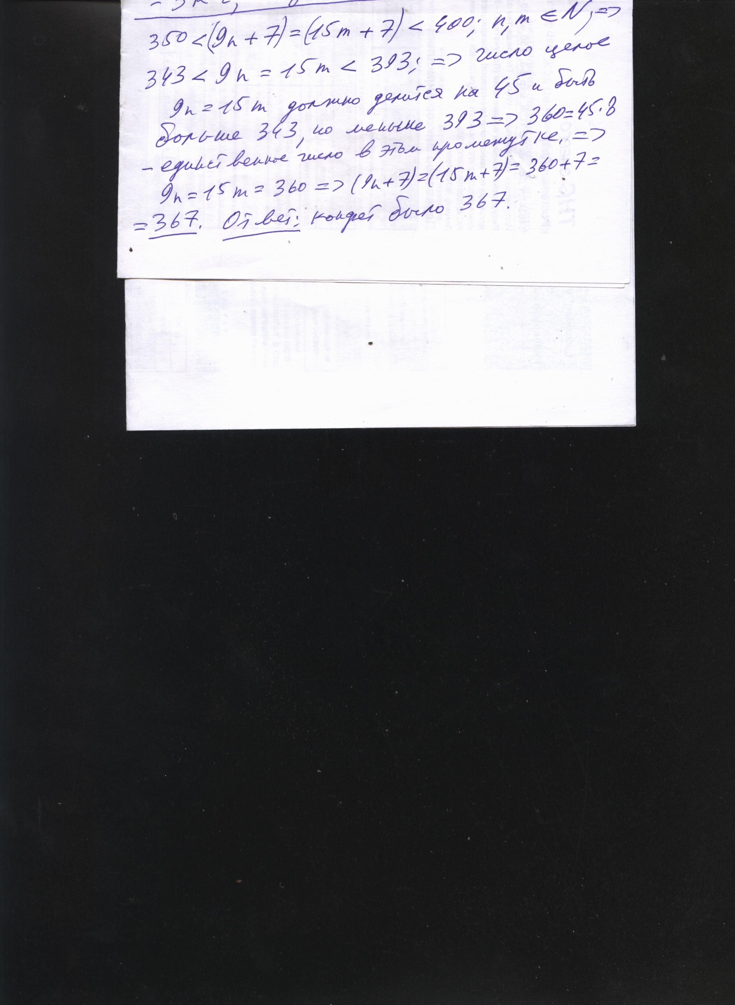 Когда конфеты упаковывали в наборы по 9 штук, для последнего набора нахватало 2 конфет. Тогда их попробовали упаковать в наборы по 15 штук. Осталось 7 лишних конфет. Сколько было конфет, если их было больше 350, но меньше 400? Укажите все возможные варианты.