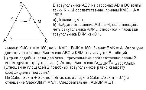 В треугольнике АВС на сторонах АВ и ВС взяты точки К и М соответственно,