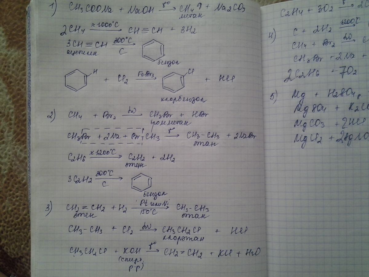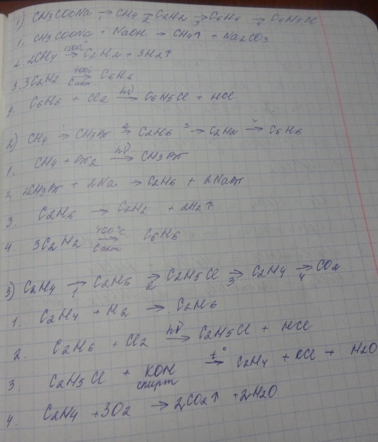 1) CH3COONa → CH4 → C2H2 → C6H6 → C6H5Cl