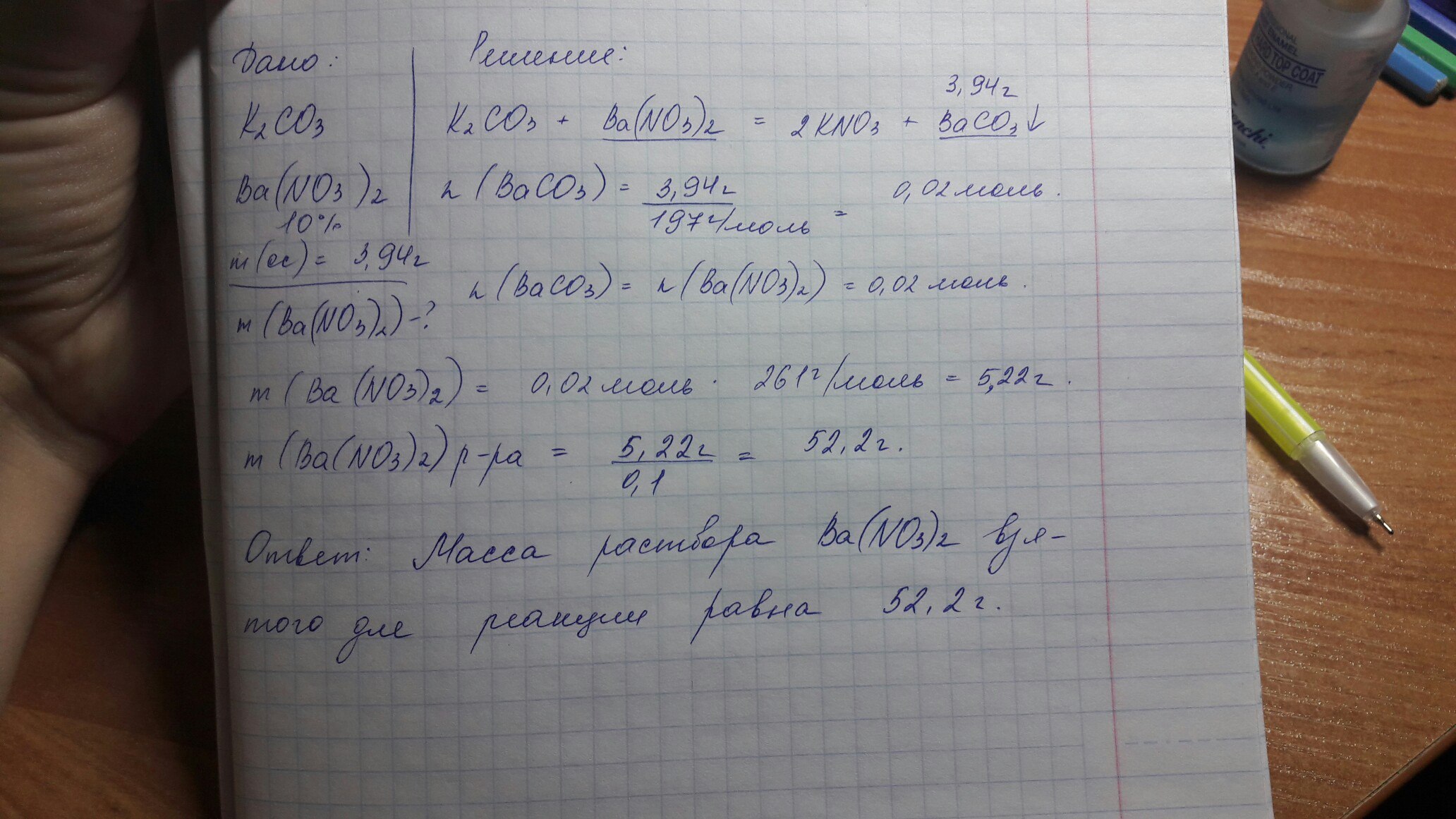 При взаимодействии K₂CO₃ с 10% Ba(NO₃)₂ получилось 3,94 грамма осадка . Определить массу Ba(NO₃)₂ взятого для опыта. И объясните решение пожалуйста