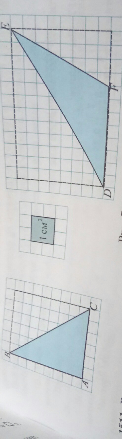 дополните треугольники АВС и DEF до прямоугольника. найдите площадь каждой фигуры в квадратных си