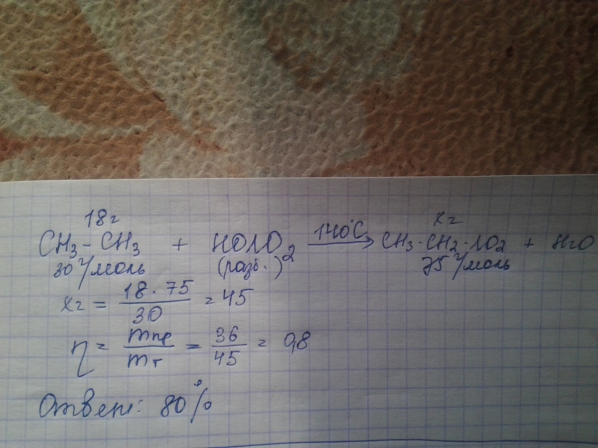 При нитровании 18 г этана азотной кислоты получили 36 г нитроэтана вычислите массовую долю(в %) выхода продукта реакции