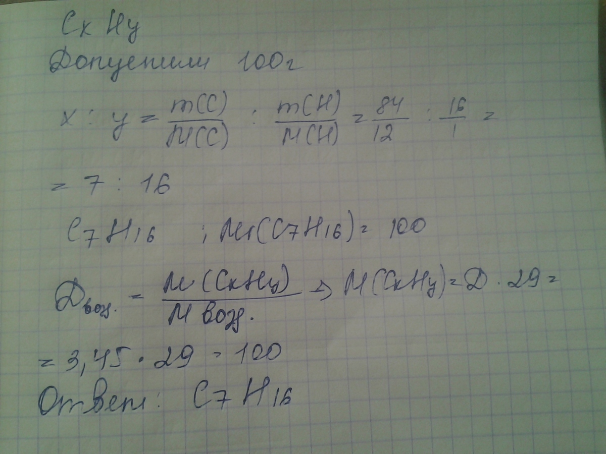 В углеводороде массовая доля углерода равна 84%.Относительная плотность паров углеводорода по воздуху равна3,45.определить молекулярную формулу углеводорода.