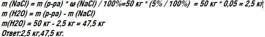 Для соления огурцов применяют 5-процентный раствор поваренной соли. Сколько соли и воды надо взять для приготовления 50кг этого раствора?