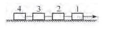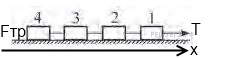 К первому бруску также прикреплена нить, за которую тянут сцепку из четырёх брусков. При этом бруски перемещаются по горизонтальной поверхности с постоянным ускорением, равным по модулю 0,5 м/с^2. Коэффициент трения между брусками и поверхностью равен 0,4. Сила натяжения нити между вторым и третьим брусками равна