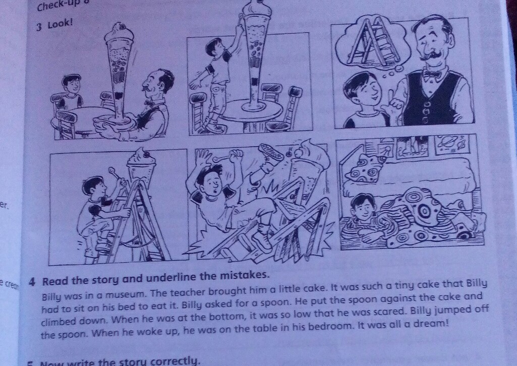 Billy was in a cafe. The waiter brought him a big cake. It was such a big cake that Billy had to stand on his chair to eat it. Billy asked for stairs. He put the stairs against the cake and climbed up. When he was on the top, it was so high that he was scared. Billy jumped off the stairs. When he woke up, he was on the floor in his bedroom.