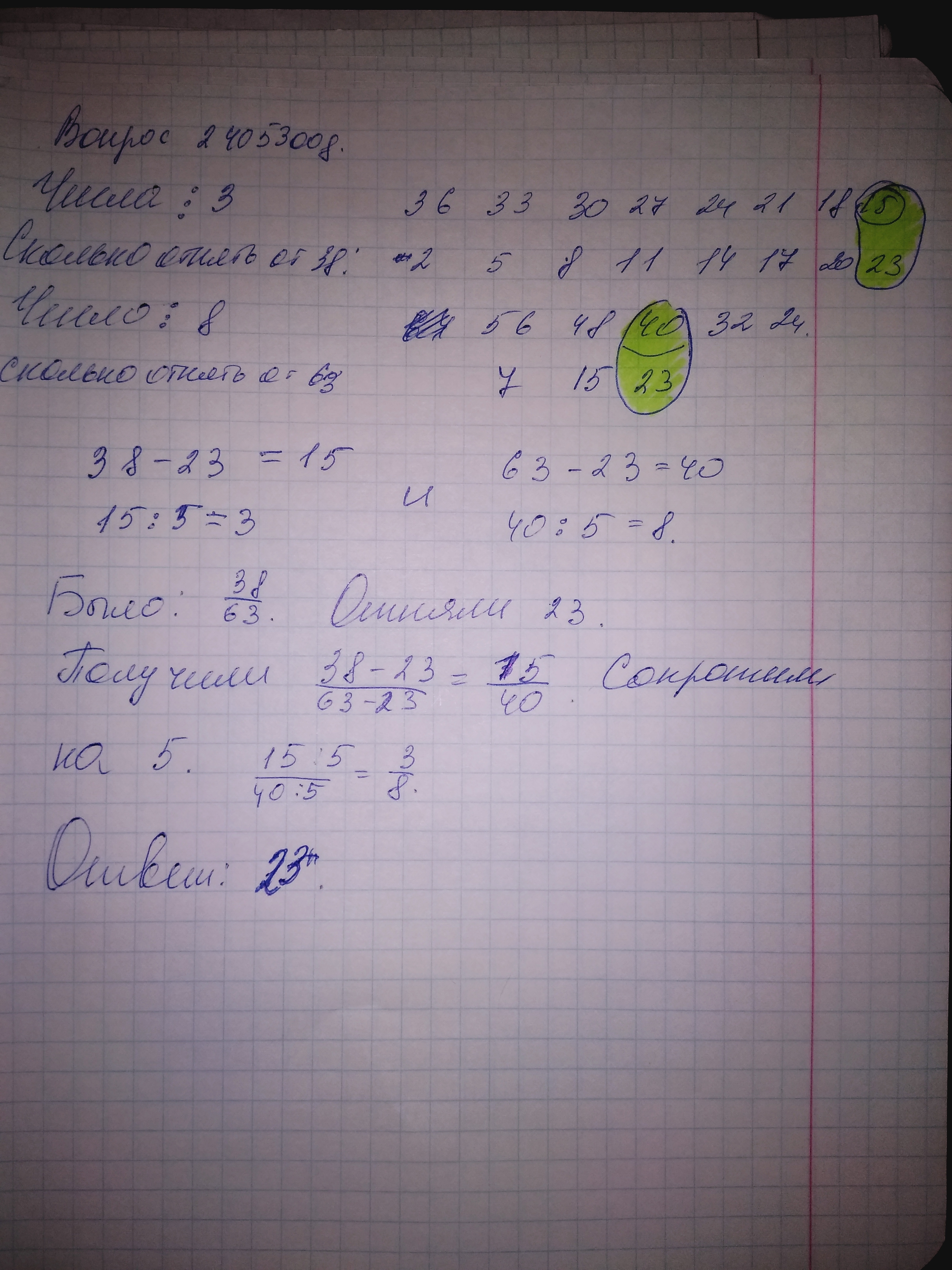 Какое одно и то же целое число надо отнять от числителя и от знаменателя дроби 3863 что бы при сокращении получить дробь 38 ?