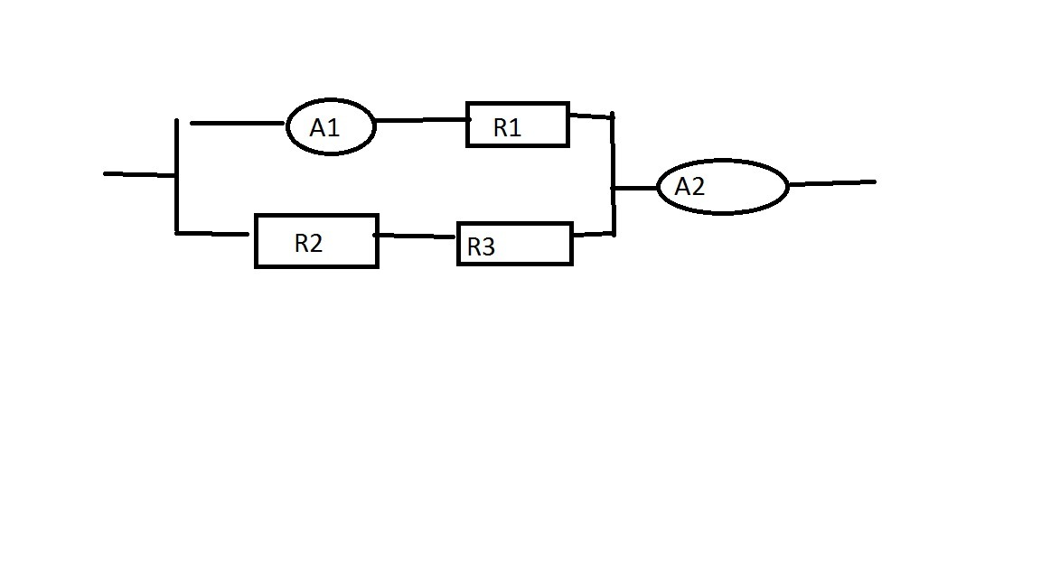 сопротивление (току!) в цепи где амперметр номер один в два раза меньше чем сопротивление в нижней цепи. Значит ток в этой цепи в два раза больше чем в нижней цепи. А в сумме эти два тока дают 3А. в верхней цепи 2А - это ответ! , в нижней один.
