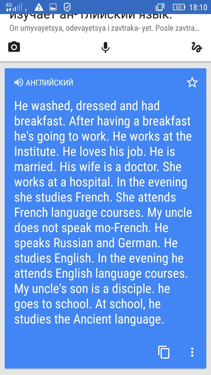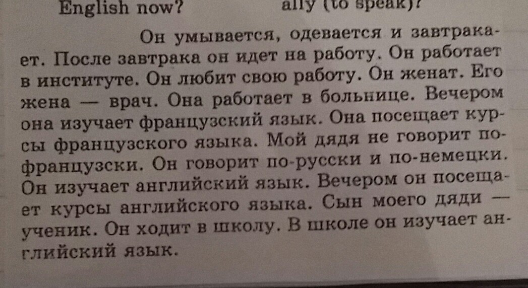 He washed, dressed and breakfasts. After having a breakfast he's going to work. He works at the Institute. He loves his job. He is married. His wife- is a doctor. She works at a hospital. In the evening she learns French language. She goes to French courses.My uncle does not speak French. He speaks Russian and German. He learns English language. In the evening he goes to English language courses. My uncle's son -is a pupil. He goes to school. At school, he learns English language .