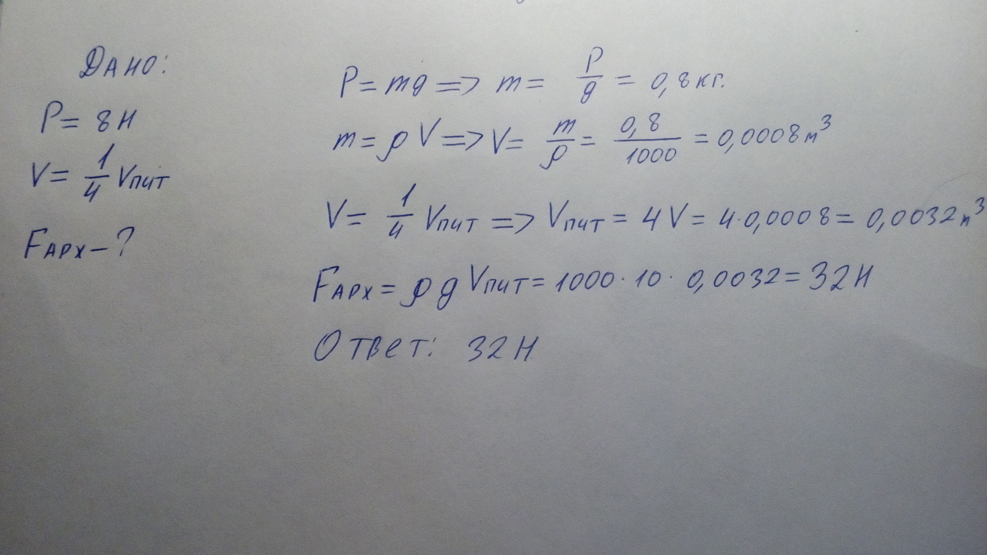 Тело весом 8 Н погружено в воду. Объем вытесненной жидкости равен 1/4 объема тела. Каково значение Архимедовой силы?