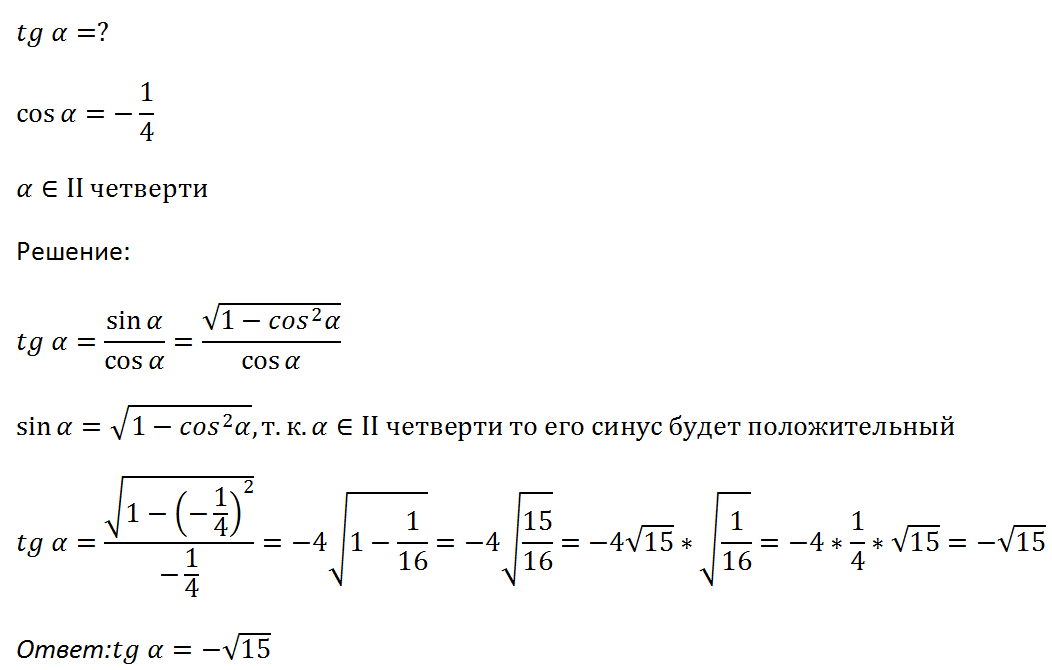 tg a=sin a/cos a=(sqrt(15)/4)/(-1/4)=-sqrt(15)