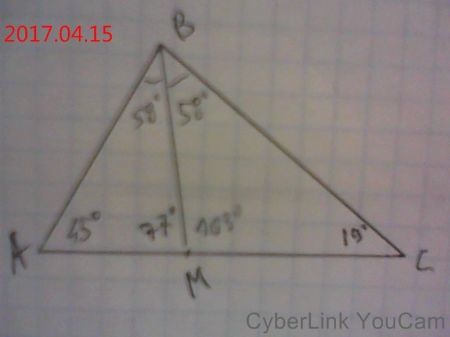 ΔАВМ. ∠ВАМ=180-∠АВМ-∠АМВ=180-58-77=45°.