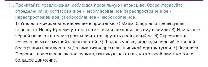 11. 1. Висевшее в простенке ( согл., распр.,обособл. ). 2. Бледная и трепещущая ( соглас., нераспр.( однород.), обособл.). 3. Мрачнее черной ночи ( несоглас., распр., обособл. ). 4. Мутной и желтоватой ( согл., нераспр., обособл.).5. Надежды полный ( несогл., распр., обособл.) 6. В ночной одетая туман ( несогл., распр., обособл. ). 7. Присмиревшая под пулями ( ( согл., распр., обособл. ).
