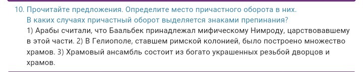 10. 1. Царствовавшему в этой части -причастный оборот. Стоит после определяемого слова Нимроду. Выделяется запятой. 2 Ставшем римской колонией - причастный оборот. Стоит после определяемого слова " в Гелиополе" в середине предложения. Запятые с обеих сторон. 3 . Из богато украшенных резьбой - причастный Стоит ПЕРЕД определяемыми словами "дворцов и храмов". Запятая не нужна.