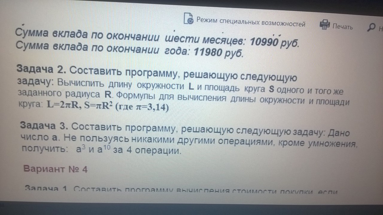 program prog;var r: real;begin write('Введите радиус: '); readln(r); writeln('Длина окружности: ' + 2 * 3.14 * r); writeln('Площадь круга: ' + 3.14 * r * r);end.