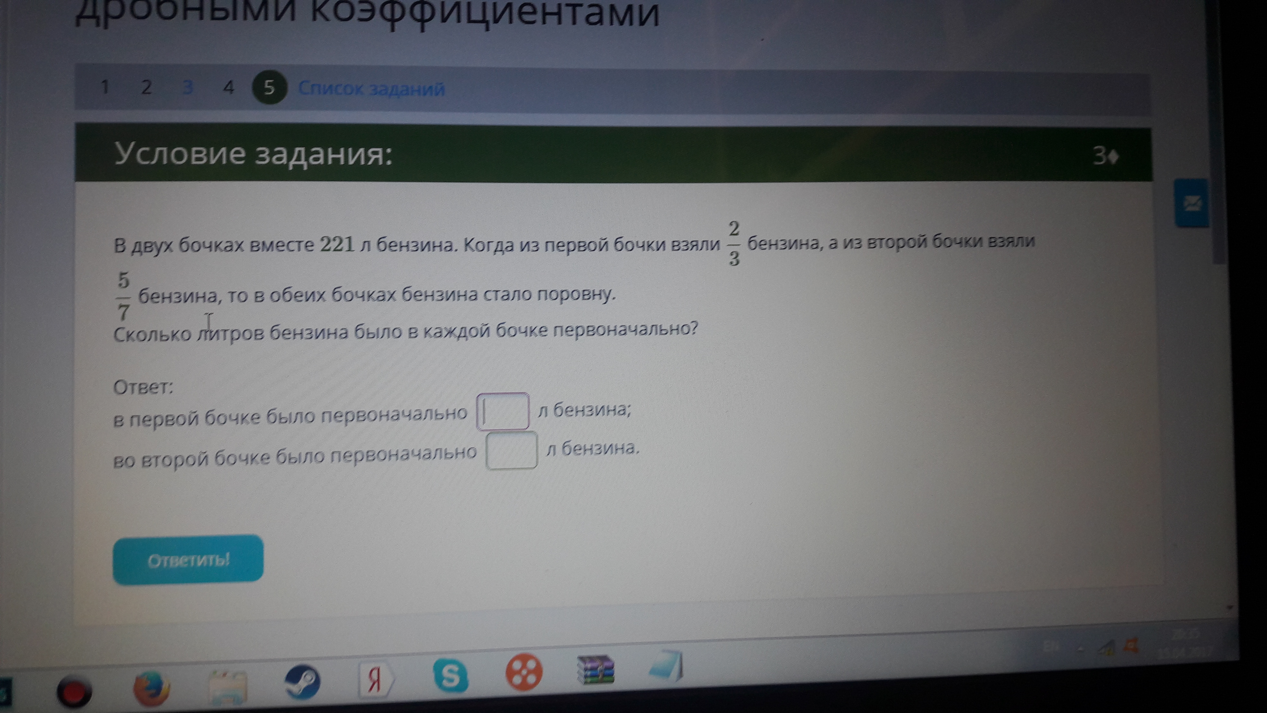 В двух бочках вместе 221 л бензина. когда из первой бочки взяли 2 и 3 бензин, А из второй бочки взяли 5 седьмых бензином, то в обеих бочках бензина стало поровну. Сколько литров бензина было в каждой бочке первоначально?