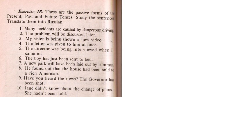 1.Много несчастных случаев вызваны опасным вождением.2.Проблема будет обговорена позже.3.Письмо было дано ему однажды4.Когда я вошёл, у директора брали интервью.5.Мальчик был отправлен в постель.6.Новый парк будет готов к лету.7.Он узнал, что дом был продан богатому американцу.8.Ты слышал новости? Губернатор был застрелен.