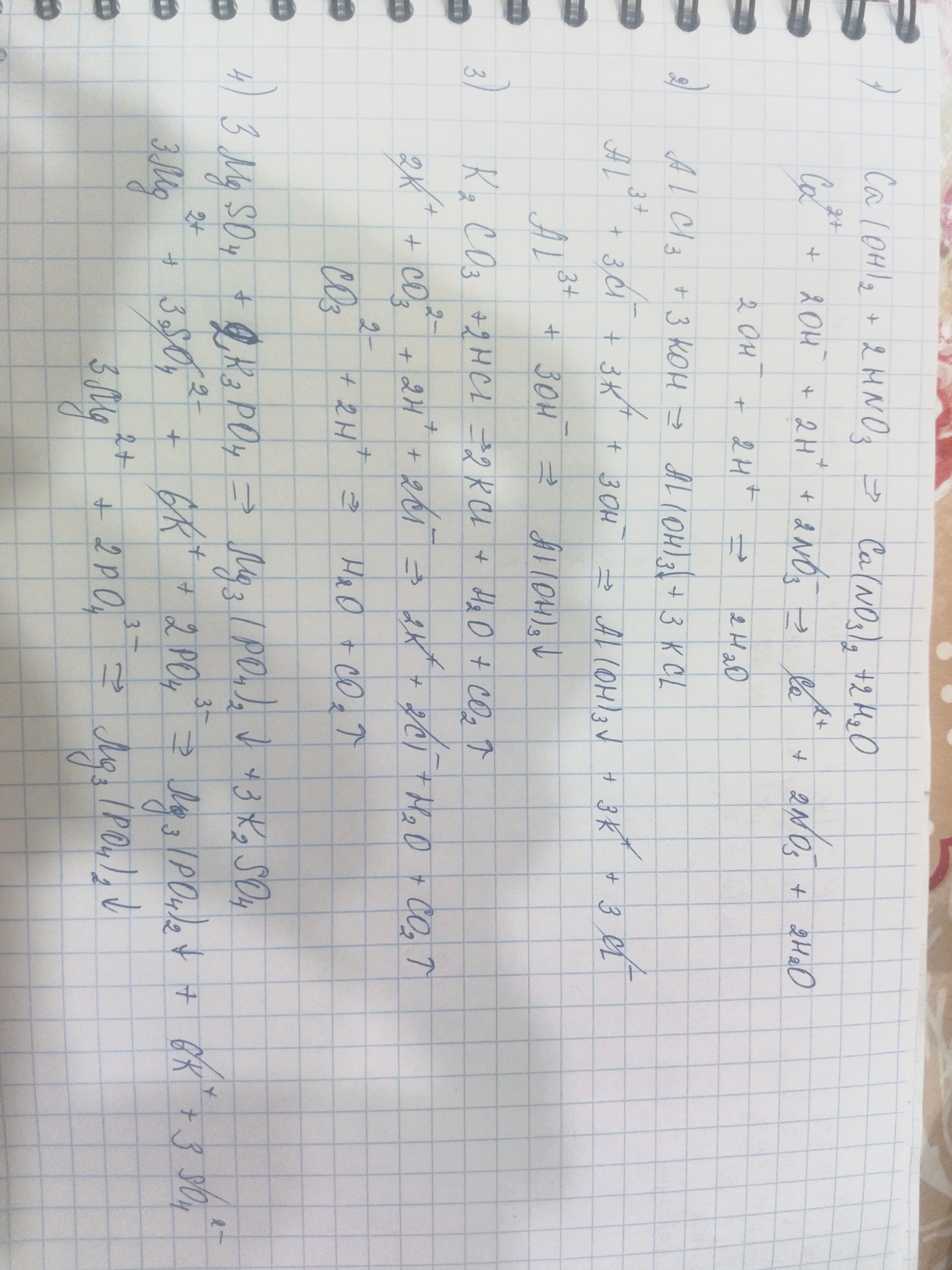 Напишите полные и сокращенные ионно-молекулярные управления следующих реакций: Ca(OH)2+Ca(NO)3-Ca(No3)2+H2O; AICI3+KOH-AI(OH)3+KCI; K2CO3+HCI-KCI+H2O+CO2; MgSO4+K3PO4-Mg3(PO4)2+K2SO4
