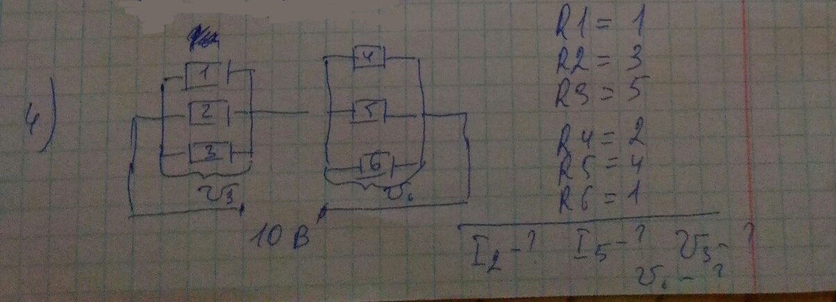 Электрическая цепь R1=1 R2=3 R3=5 R4=2 R5+4 R6=1 I2-? I5-? U3-? U6-?