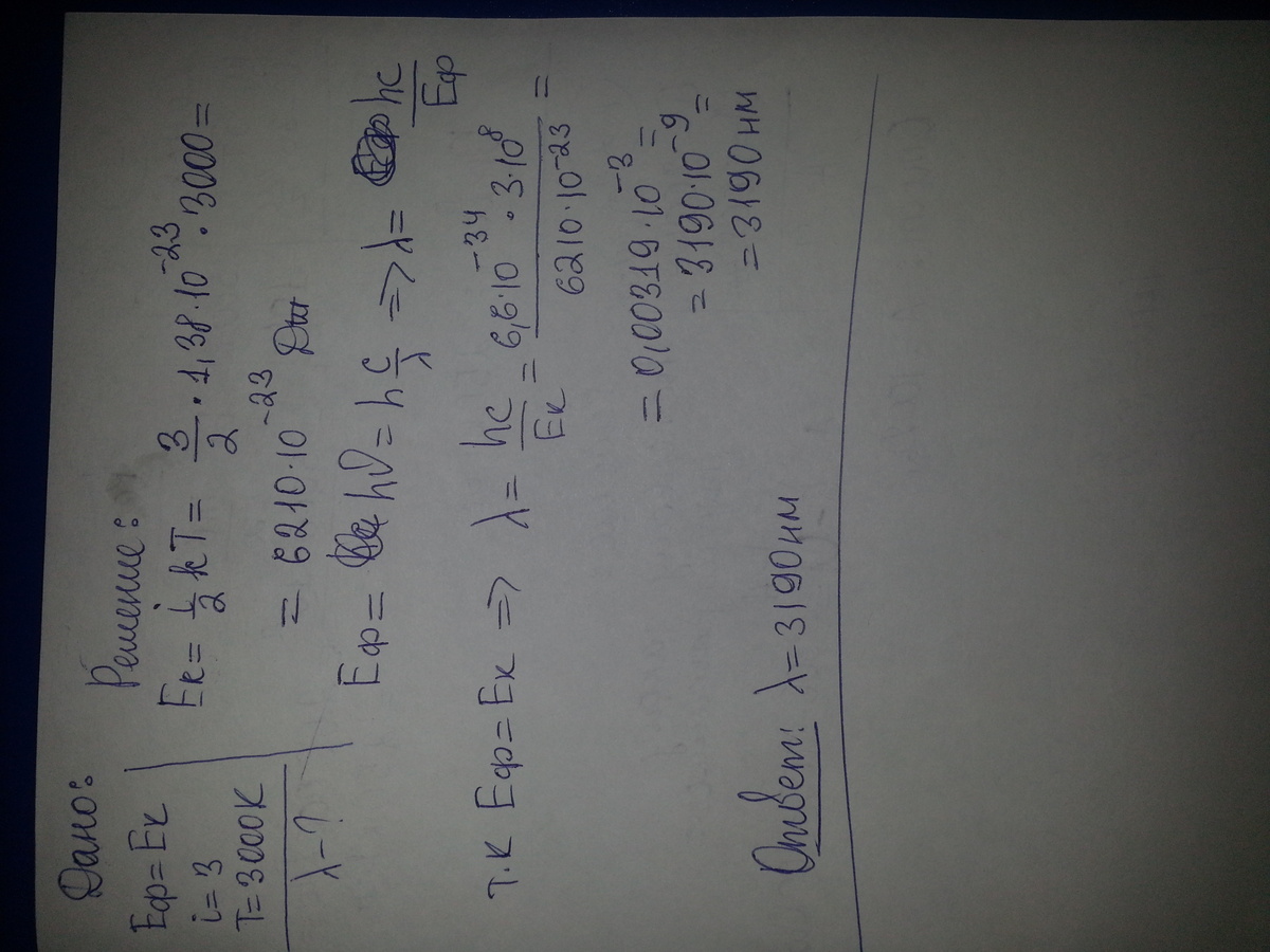 Какова длина волны фотона, энергия которого равна средней кинетической энергии молекулы идеального одноатомного газа при температуре Т = 3000 К?