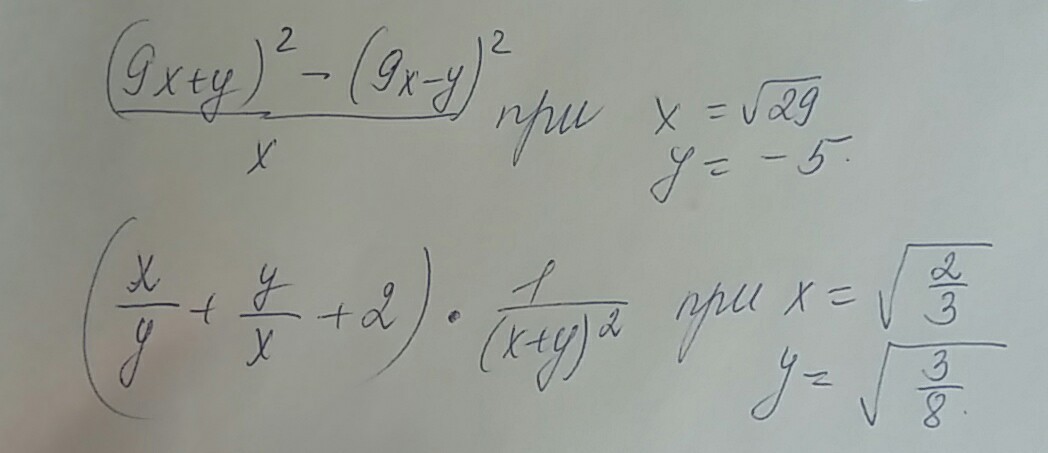 2. В первой скобке можно привести всё к общему знаменателю, потом умножить на вторую дробь: ((х+у)²/ху)* 1/(х+у)² = 1/ху=√(3/2*8/3)=2