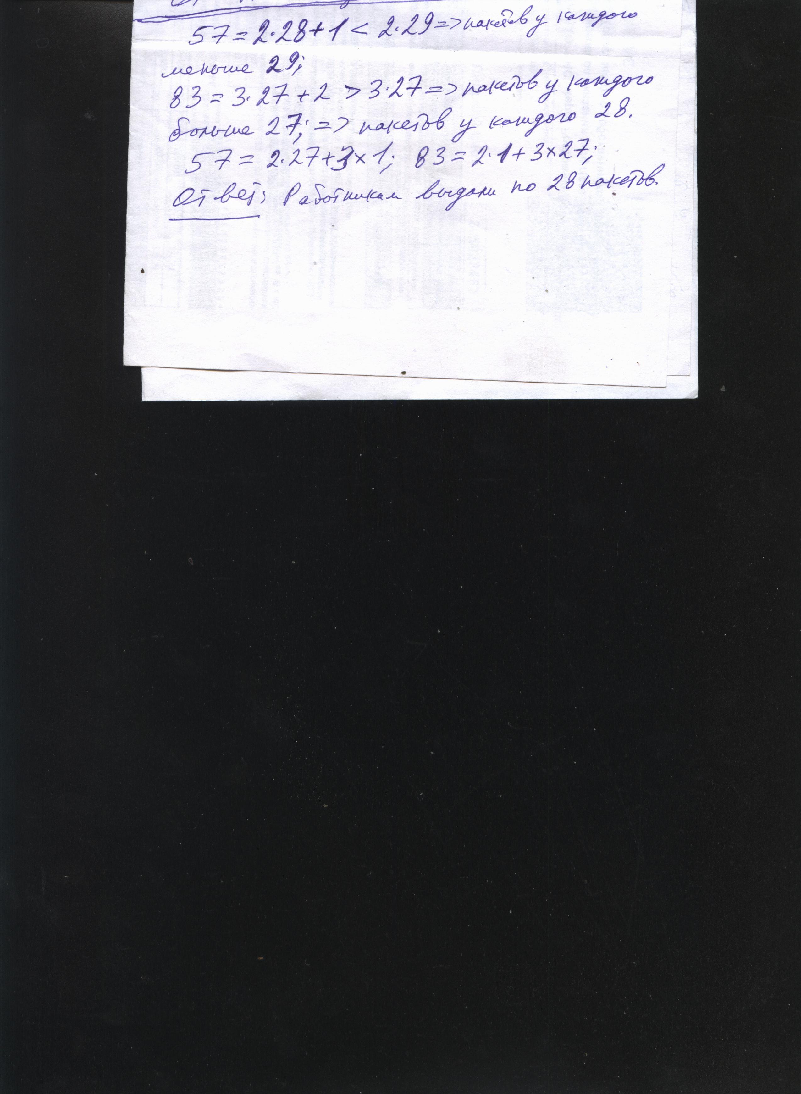Из одного пакета сухого корма работник зоопарка может приготовить 3 порции еды для лисы или 2 порции еды для волка. Из одного числа выданных пакетов один работник приготовил 57 порций еды, а второй – 83 порции. По сколько пакетов корма выдали работникам? Запишите решение и ответ.