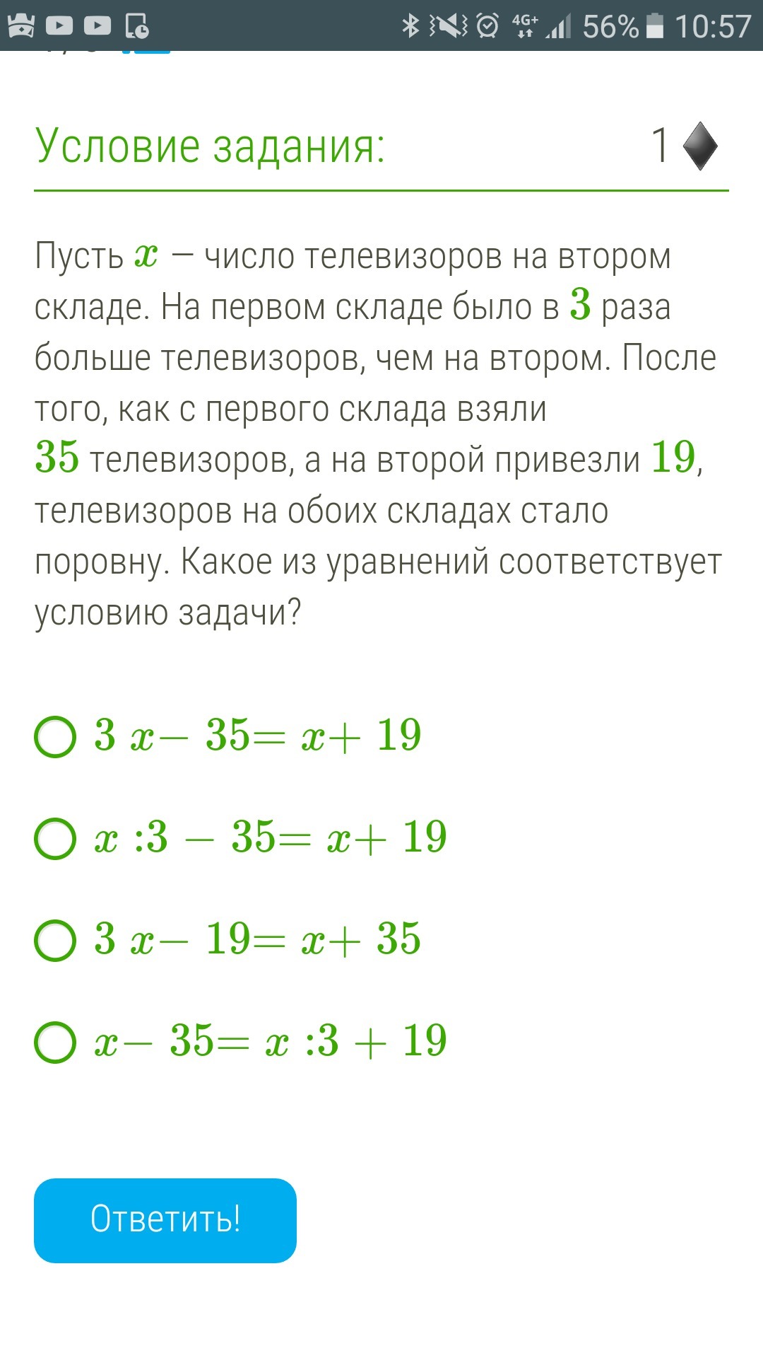 Пусть x — число телевизоров на первом складе. На первом складе было в 3 раза больше телевизоров, чем на втором. После того, как с первого склада взяли 15 телевизоров, а на второй привезли 17, телевизоров на обоих складах стало поровну. Какое из уравнений соответствует условию задачи?
