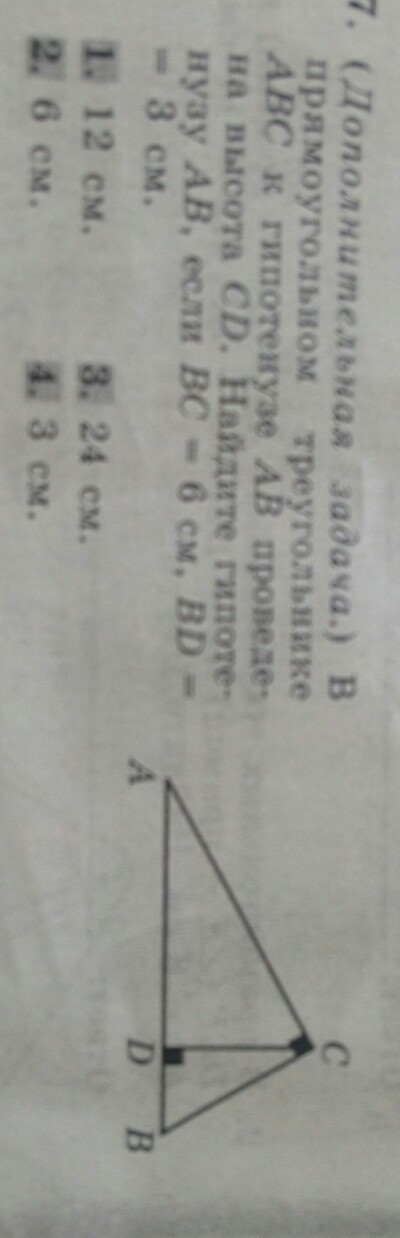В прямоугольном треугольнике ABC к гипотенузе AB проведена высота CD. Найдите гипотенузу AB есди BC 6 см BD 3 см
