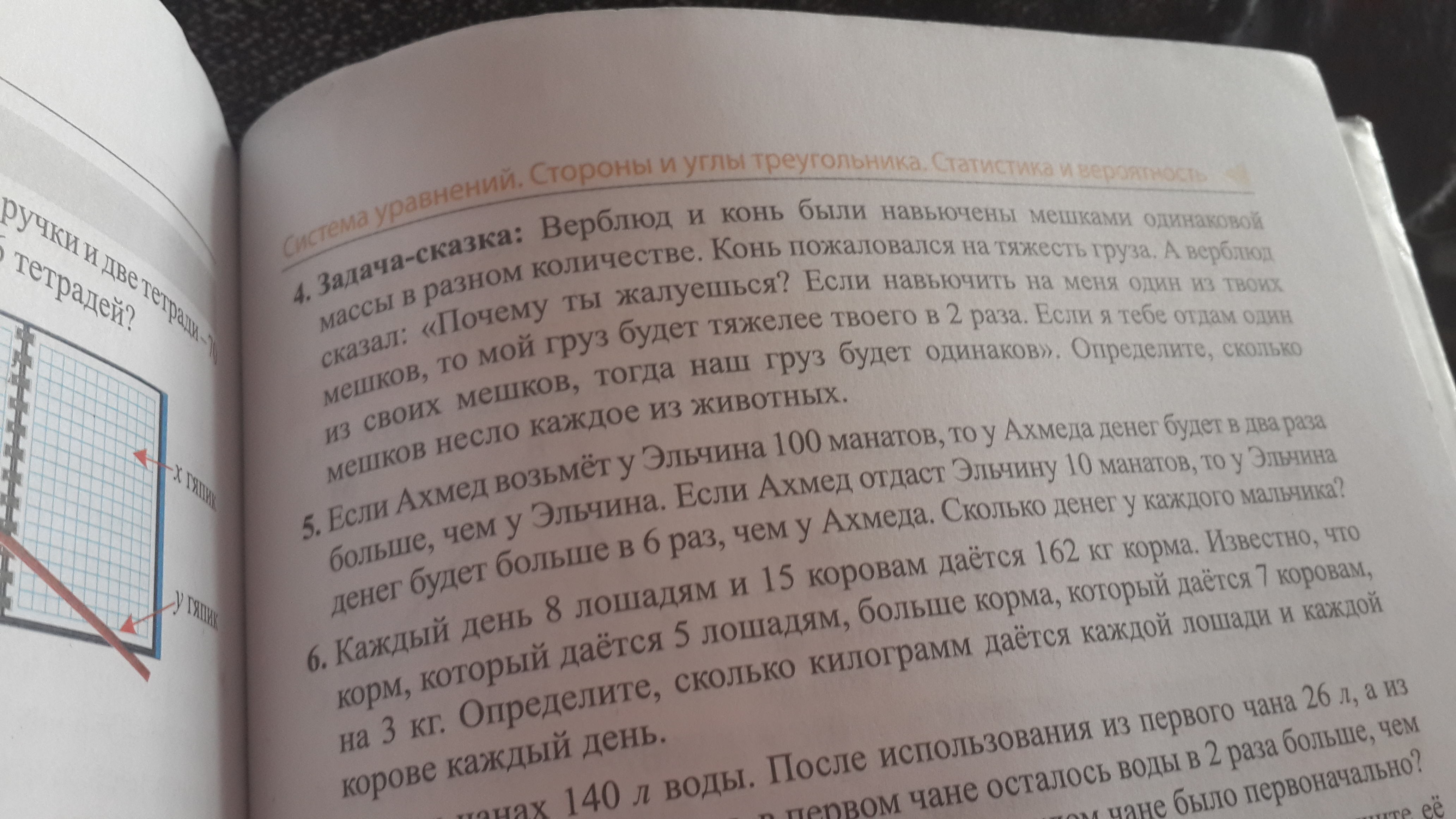 5)Пусть Ахмед — х, а Эльчин — у, тогда: Х+100=2(у-100), х+100=2у-200, х-2у=-300; 6(Х-10)=у+10, 6х-60=у+10, (домножаем на -2) ⇒-12х+120=-2у-20,-12х+2у=-140 (складываем итоговые уравнения) -11х=-440; х=40 (подставляем в уравнение)⇒ 40-2у=-300; -2у=-340; у=170 Ответ: у Ахмеда было 40 манат, а у Эльчина — 170