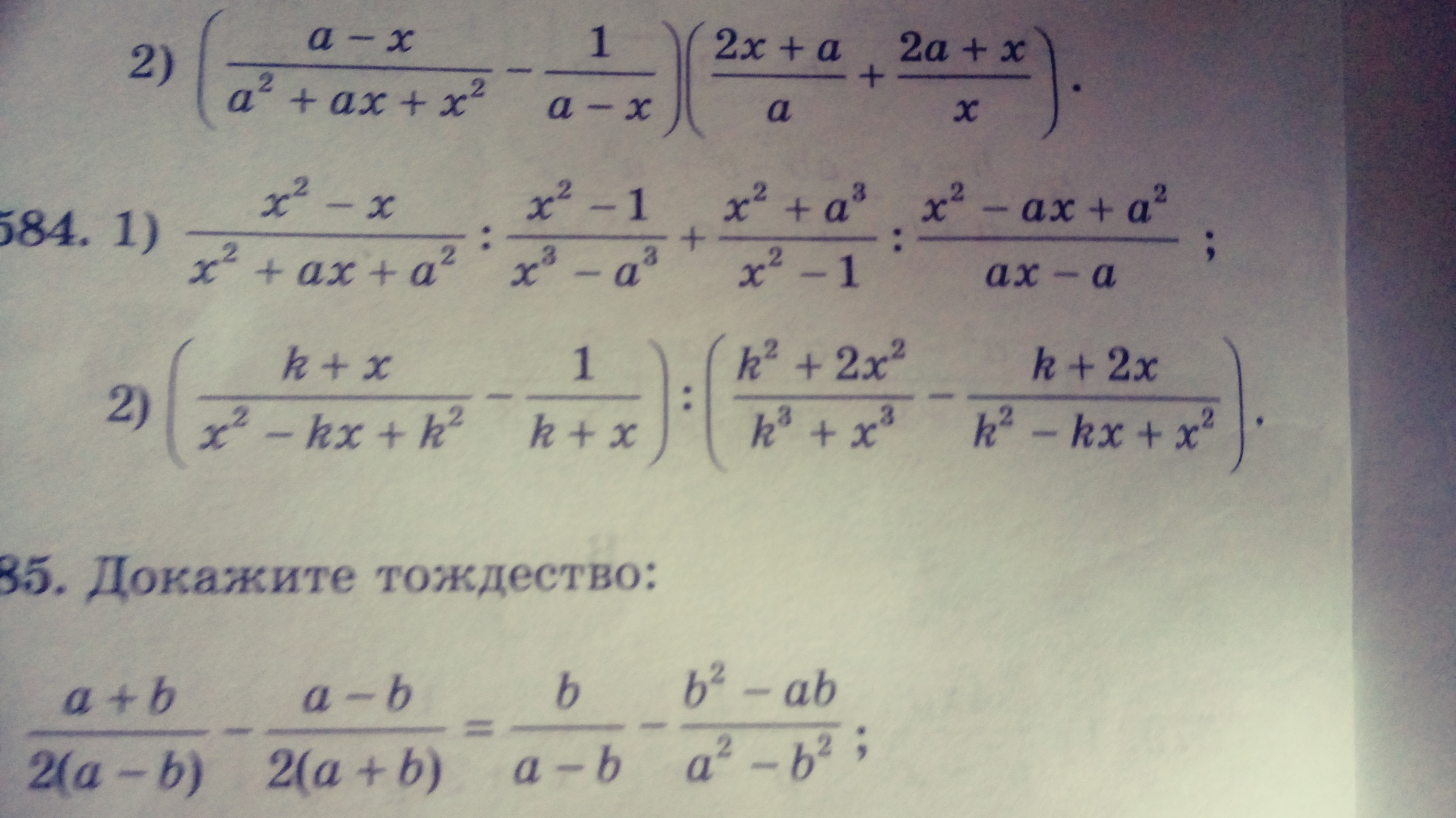 ( frac{ k^{2}+2 x^{2} - k^{2} -2kx-kx- x^{2} }{ k^{3} + x^{3} } = [tex] frac{3kx}{ k^{3}+ x^{3} } ÷ frac{3kx}{ k^{3} + x^{3} } = 1;](https://tex.z-dn.net/?f=%28+frac%7B+k%5E%7B2%7D%2Bkx%2Bkx%2B+x%5E%7B2%7D+-+x%5E%7B2%7D+%2Bkx-+k%5E%7B2%7D++%7D%7B+k%5E%7B3%7D++x+%2Bx%5E%7B3%7D++%7D%29+%C3%B7%0A%28+frac%7B+k%5E%7B2%7D%2B2+x%5E%7B2%7D+-+k%5E%7B2%7D+-2kx-kx-+x%5E%7B2%7D++%7D%7B+k%5E%7B3%7D+%2B+x%5E%7B3%7D+%7D++%3D%C2%A0%5Btex%5D+frac%7B3kx%7D%7B+k%5E%7B3%7D%2B+x%5E%7B3%7D+%7D++%C3%B7+frac%7B3kx%7D%7B+k%5E%7B3%7D+%2B+x%5E%7B3%7D+%7D+%3D+1%3B+)