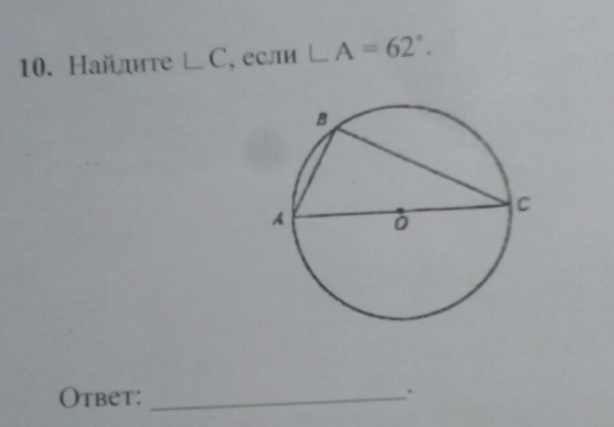 Угол В=90 тк опирается на диагональ. А=62 С=180-90-62=28