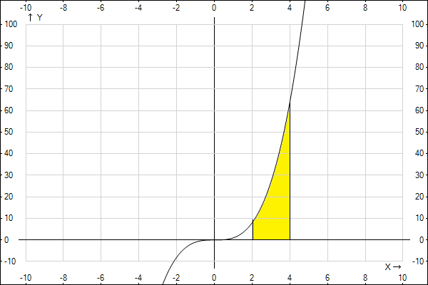 Пределы интегрирования - от 2 до 4, первообразная f(x), т.е. f(x)=∫x³dx=x⁴/4.