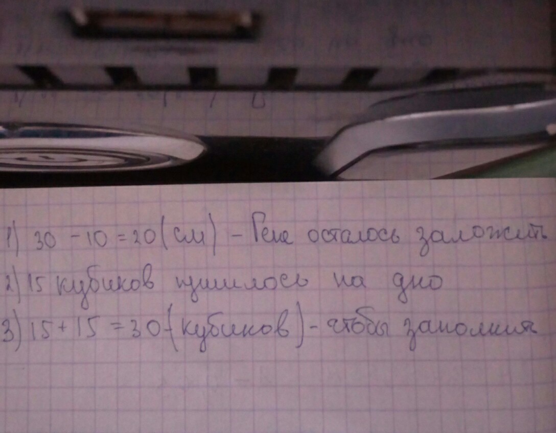 Гена начал складывать одинаковые кубики в коробку, высота которой 30 см. Высота одного кубика 10 см. После того как Гена выложил кубики на дно коробки, полностью закрыв его ( см. рисунок), мама позвала его ужинать . Сколько кубиков Гена должен уложить после ужина , чтобы заполнить коробку доверху.