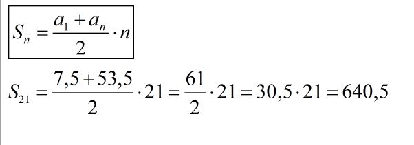 арифметическая прогрессия 7,5+9,8+12,1+...+53,5 объясните пожалуйста откуда они взяли ответ 640,5?Для облегчения сразу скажу вам d=2.3 a21=53,5