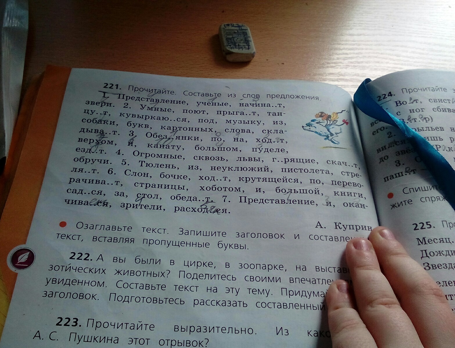 Ученые звери начинают представление. Умные собаки поют, прыгают, кувыркаются, танцуют под музыку, складывают из картонных букв слова. Обезьянки ходят по канату и ездят верхом на большом пуделе. Огромные львы скачут сквозь горящие обручи. Неуклюжий тюлень стрелчет из пистолета. Слон ходит по крутящейся бочке ,хоботом переворачивает страницы большой книги, садится за а стол и обедает. Представление оканчивается, и зрители расходятся.