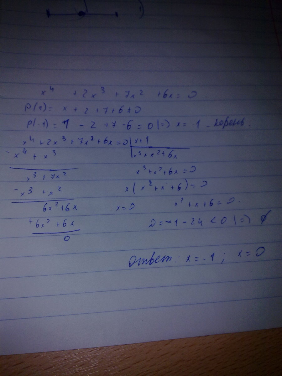 Сначала ишем P,найденное P - заведомо одно из решений уравнения,затем почленно делим и получаем уравнение третьей степени,выносим х за скобку,получаем два решения.