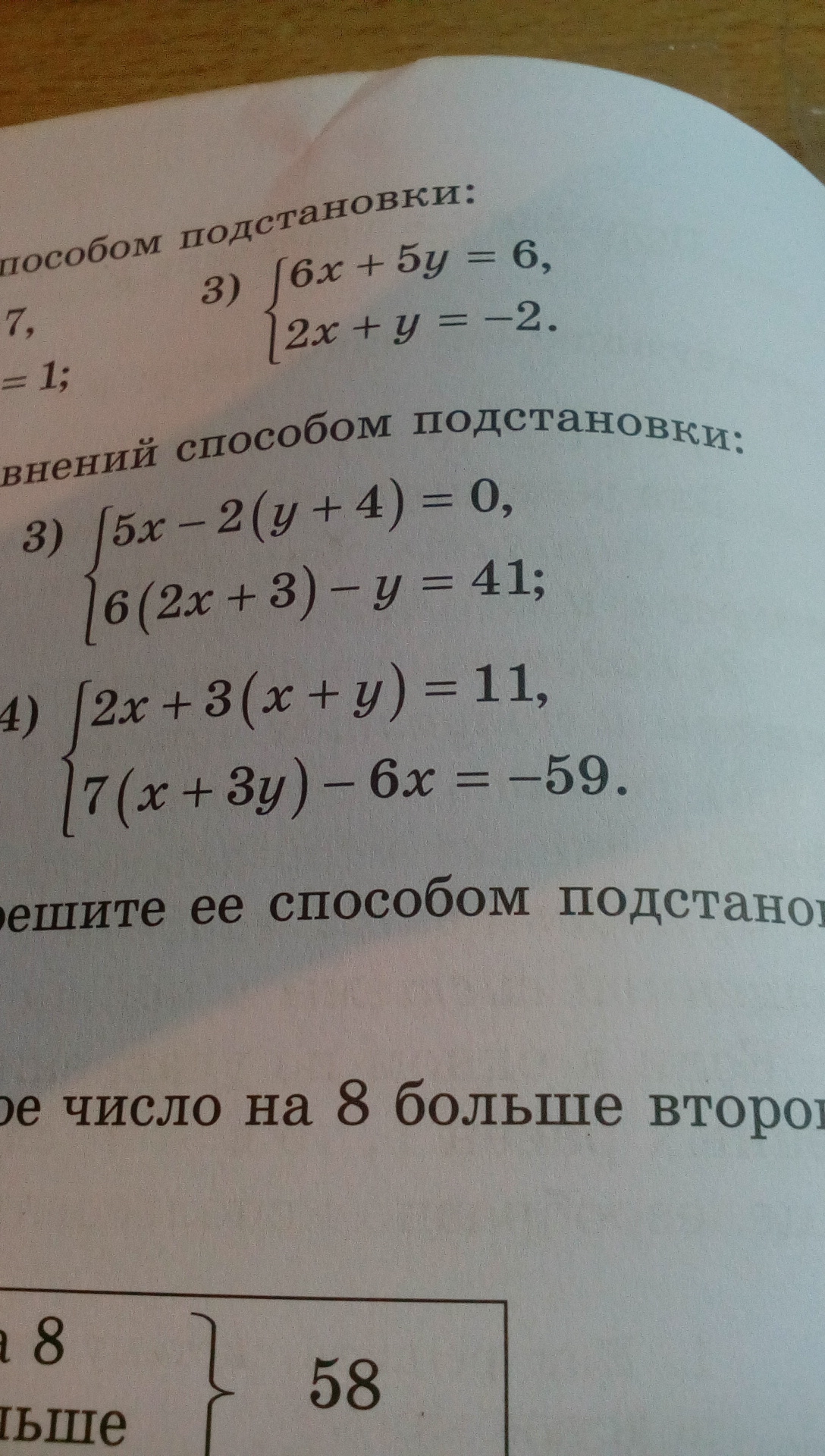 подстановка- ты должна выразить х через у или наоборот. например в 3 задании 2 уравнение становится у=6(2х+3)-41. Затем это выражение подставляешь в первое уравнение вместо у. Получается 5х - 2(6(2х+3)-41+4)=0 . Это уравнение с одной переменной, которое, раскрыв скобки, ты с легкостью решишь. Получишь х и подставишь во второе уравнение(у=6(2х+3)-41) Так ты найдешь у и в ответе будет пара чисел