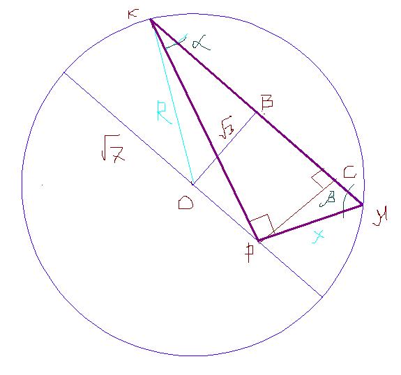 Гипотенуза КМ прямоугольного треугольника КМР является хордой окружности радиуда корень7. вершина Р находится на диаметре, который параллелен гипотенузе. расстояние от центра окружности до гипотенузы равна корень 3. найдите остарые углы треугольника КМР