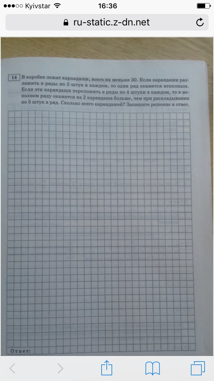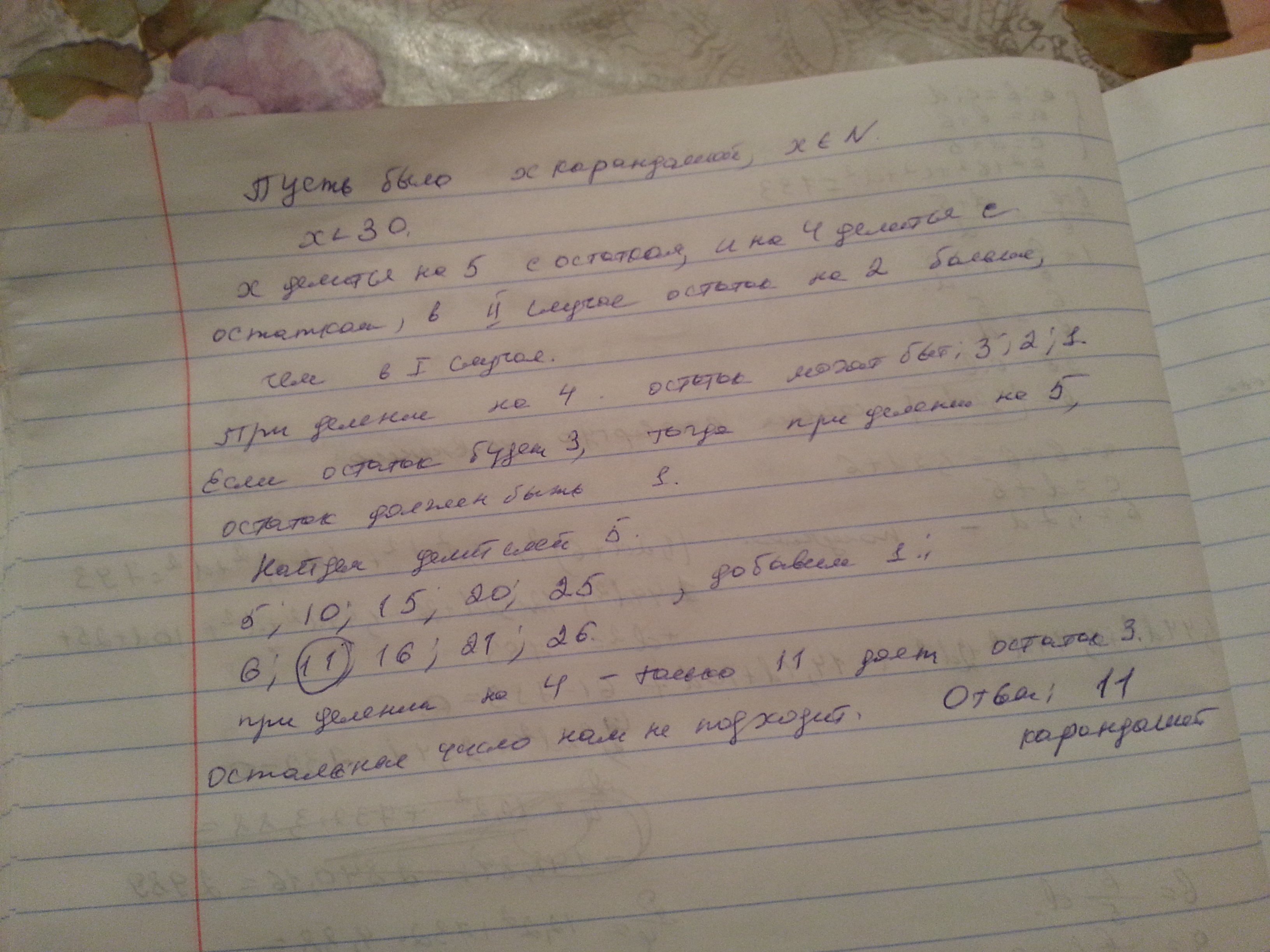 В коробке лежат карандаши,всего их меньше 30.Если карандаши разложить ряды по 5 штук в каждом,то один ряд окажется неполным.Если карандаши переложить ряды по 4 штуки в каждом,то в неполном ряду окажется на 2 карандаша больше,чем при раскладывании по 5 штук в ряд.Сколько всего карандашей? Решить не подбором и с объяснением.