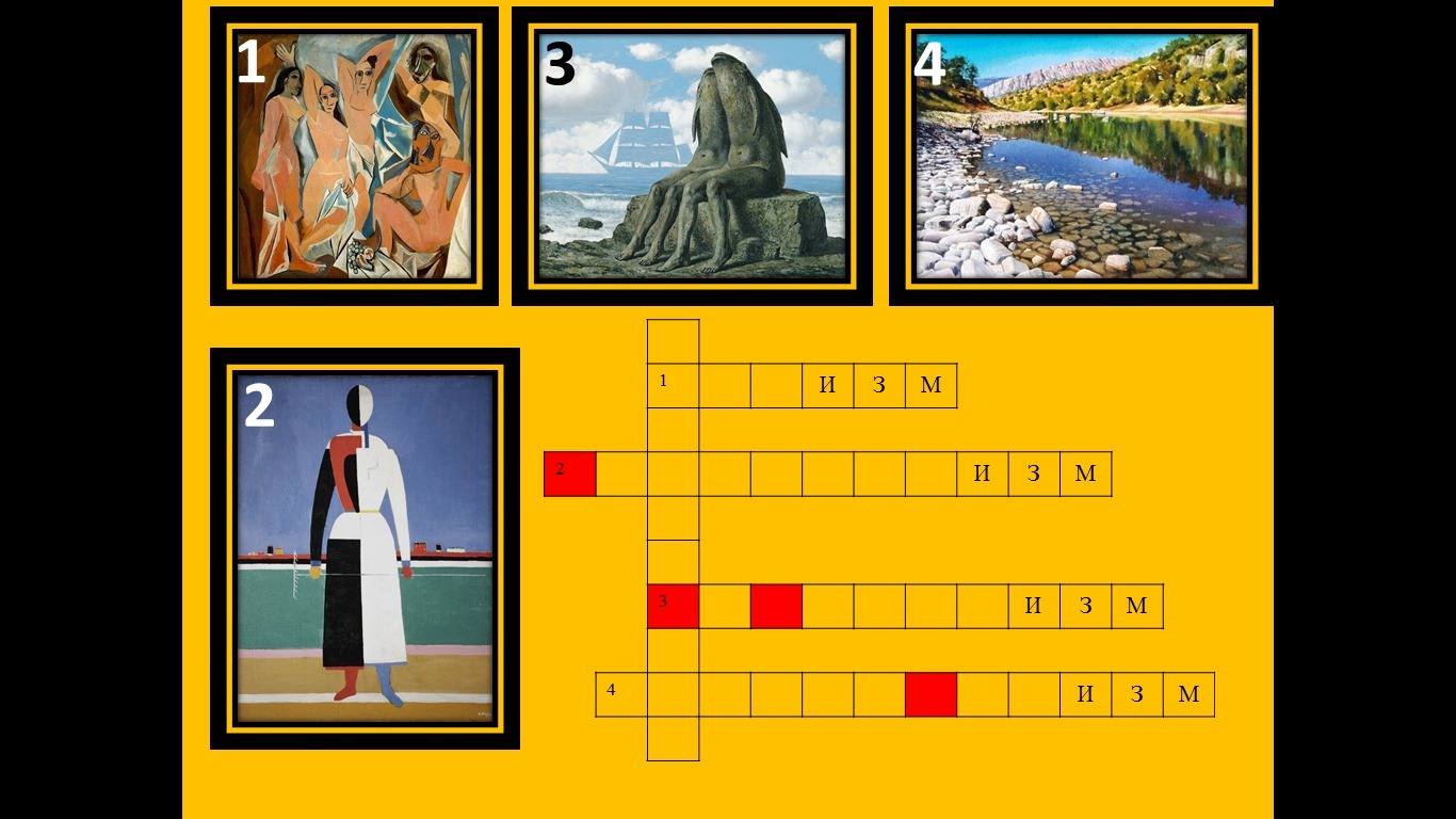 Решите кроссворд, вписав в него названия направлений живописи, соответствующих представленным картинам. Получите по вертикали ключевое слово, добавив в него недостающие буквы из тех, которые выделены, при этом первую и последнюю буквы добавьте самостоятельно.
