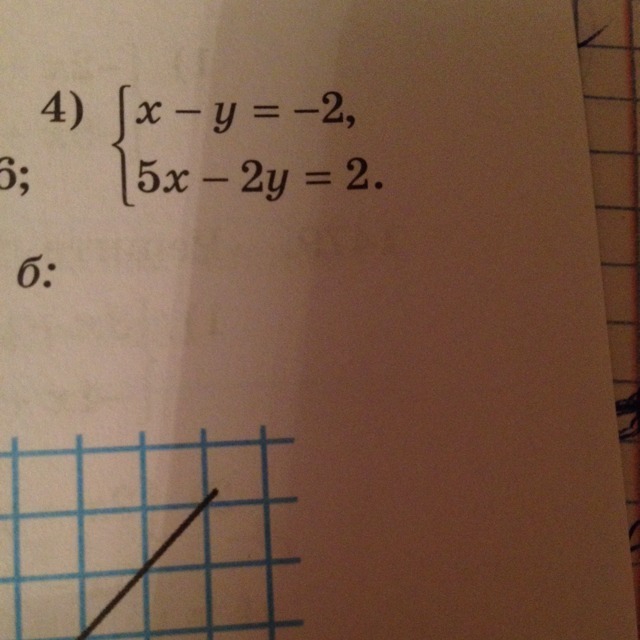 left { {{x-y=-2} atop {5x-2y=2}} right. = left { {{x=-2+y} atop {5(-2+y)-2y=2}} right. =  left { {{x=-2+y} atop {3y=12}} =  left { {{x=-2+4} atop {y=4}} right. =  left { {{x=2} atop {y=4}} right.