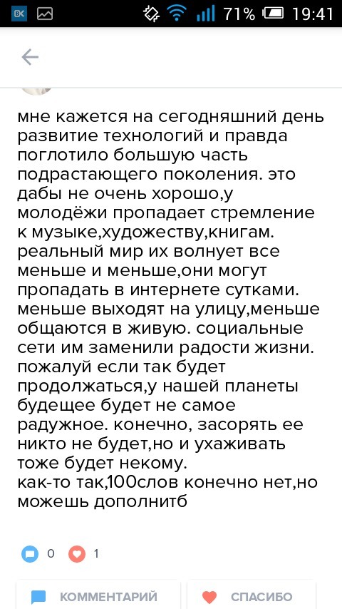 I think today the development of technology and really consumed a great part of the younger generation. This is so not good, young people don't have a desire for music, art, books. The real world cares less and less, they can be on the Internet all day. Less facing the street, communicate less in person. The social network has replaced their joy of life. Perhaps, if this continues, our planet has a future is not the brightest one. Of course, to pollute it, no one will, but to care too, no one will.