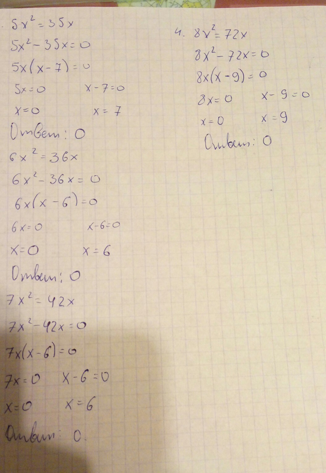 Решите уравнение 8x^2=72x.