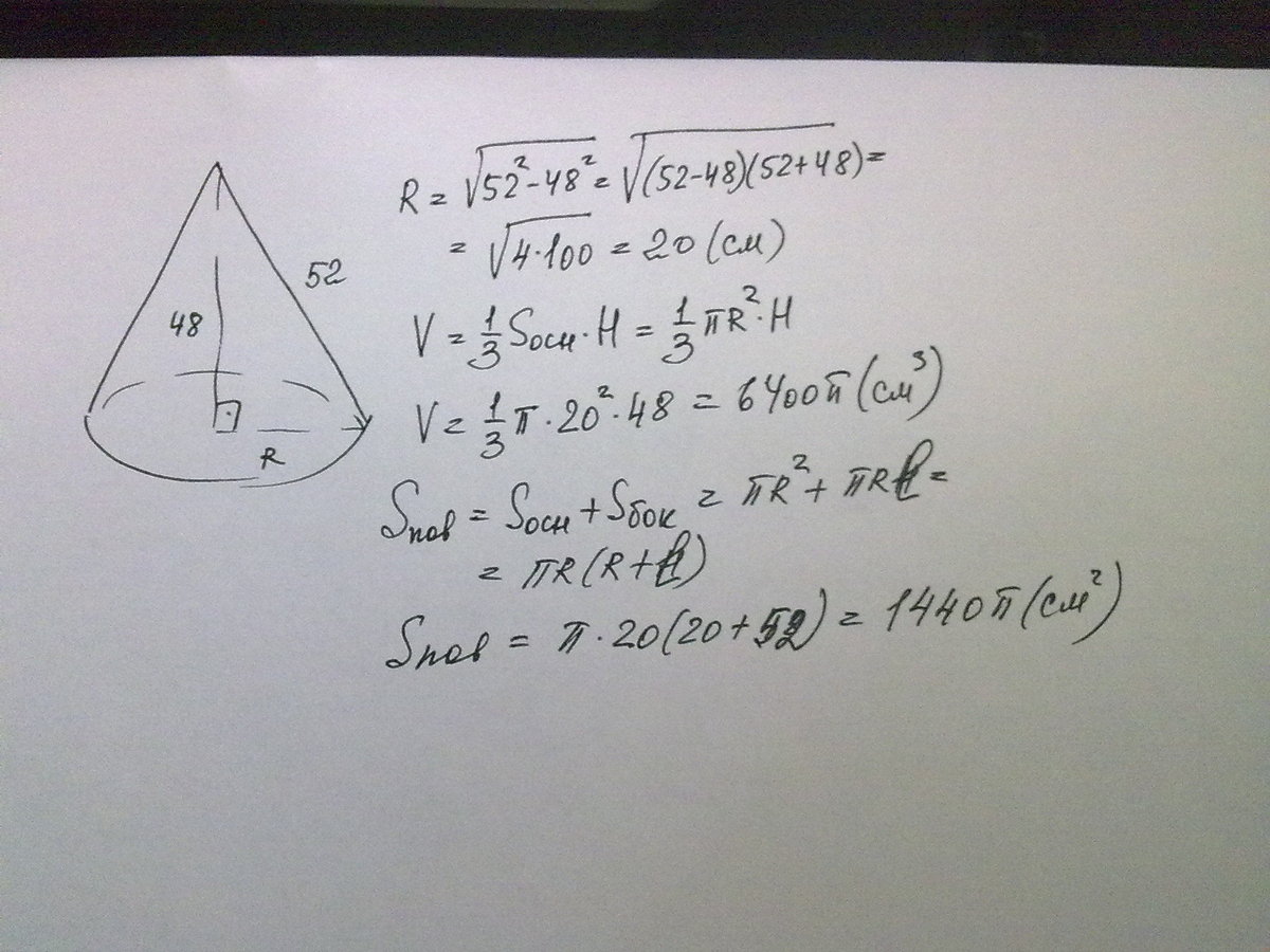 образующая конуса 52 см высота 48 см. Найти объем и площадь полной поверхности