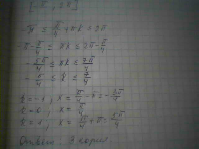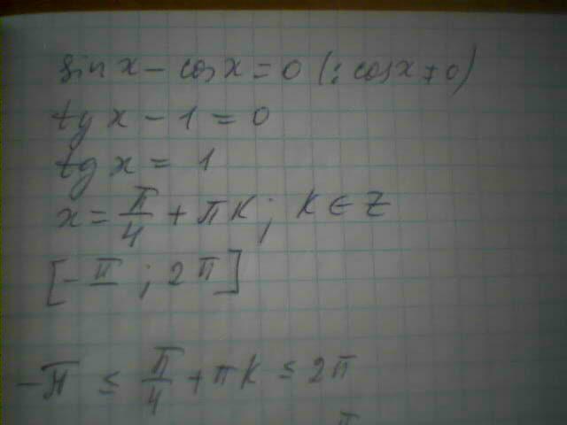 Решите уравнение sinx-cosx=0. В ответ укажите количество корней уравнения, принадлежащих отрезку [-пи; 2пи]