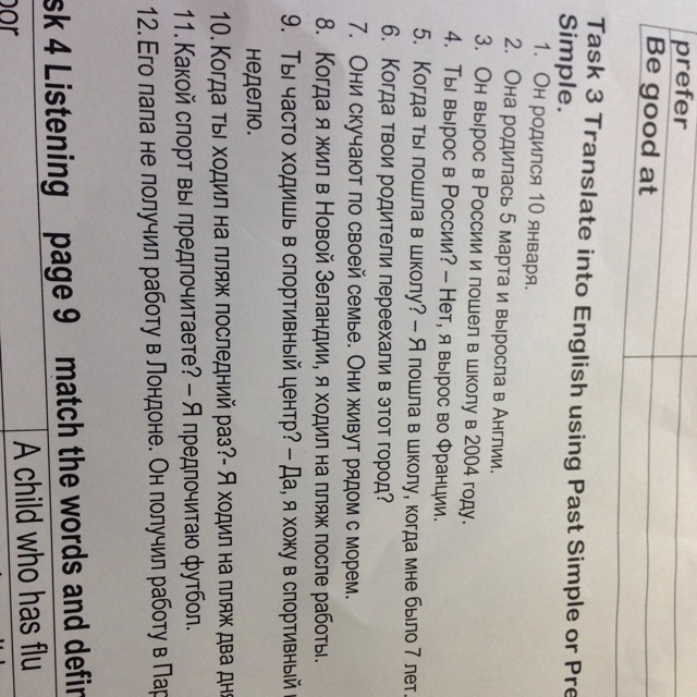 1)He was born 10 Jan 2)She was born 5 Mar and raised in England3) He grew up in Russia and went to school in 2004 4) You have grown in Russia ? I grew up in France5) When you went to school ? - I went to school when I was 7 years old6) When your parents move to this city ? 7) They miss their family. They live near the sea 8) When I lived in new Zealand, I went to the beach after work 9) do You often go to the sports centre ? - Ah, I often go to Spotify center10) When you went to the beach last time ? - I went to the beach 2 days ago 11) What sport do you prefer ? - I prefer football12)His dad got a job in London. He got a job in Paris