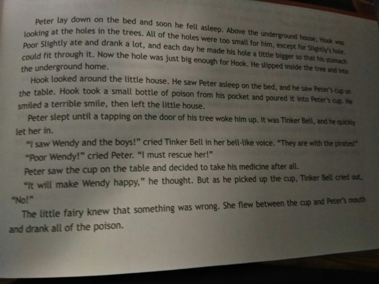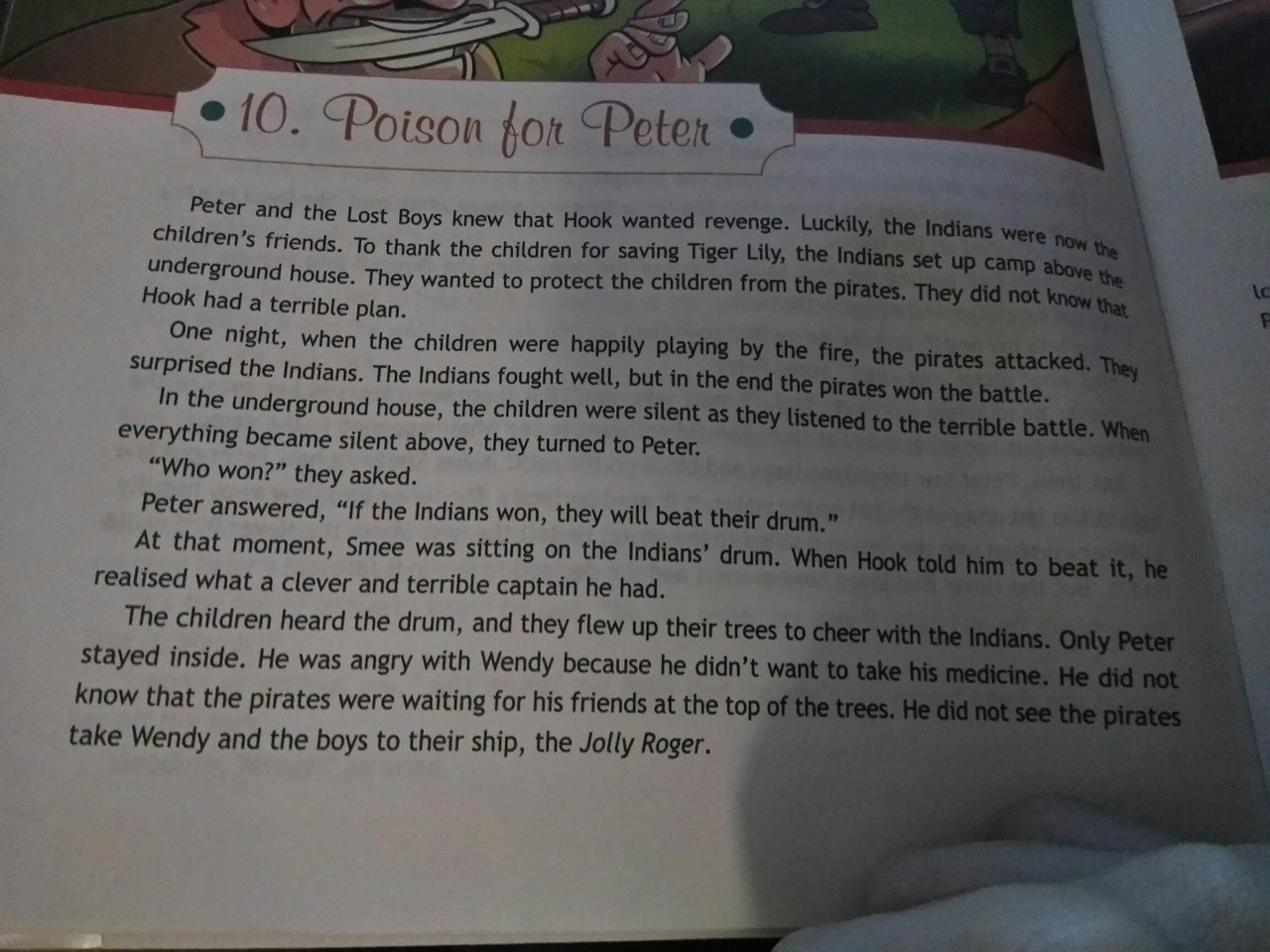 10. Яд с Питером и Мальчиками знал, что Хук хотел отомстить. Повезло, индейцы были детьми. Чтобы поблагодарить за спасение Тигра Лит, индейцы создали лагерь над подземным домом. Они хотели защитить детей от пиратов. У них не было страшного плана. Однажды ночью, когда дети весело играли у огня, пираты напали. Удивили индейцев. Индейцы сражались хорошо, но в конце концов пираты выиграли битву. В подземном доме дети молчали, слушая страшную битву. Когда все стало выше, они повернулись к Питеру. "Кто выиграл?" они спросили. Питер ответил: «Если индейцы победят, они будут бить свой барабан». В тот момент Сми сидел на барабане индейцев. Когда Крюк велел ему победить, он понял, какой у него умный и страшный капитан. Дети услышали барабан, и они взлетели на своих деревьях, чтобы подбодрить индейцев. Только Питер остался внутри. Он сердился на Венди, потому что не хотел принимать лекарство. Он не знал, что пираты ждут своих друзей на вершине деревьев. Он видел, как пираты забрали Венди и мальчиков на свой корабль, «Веселый Роджер».