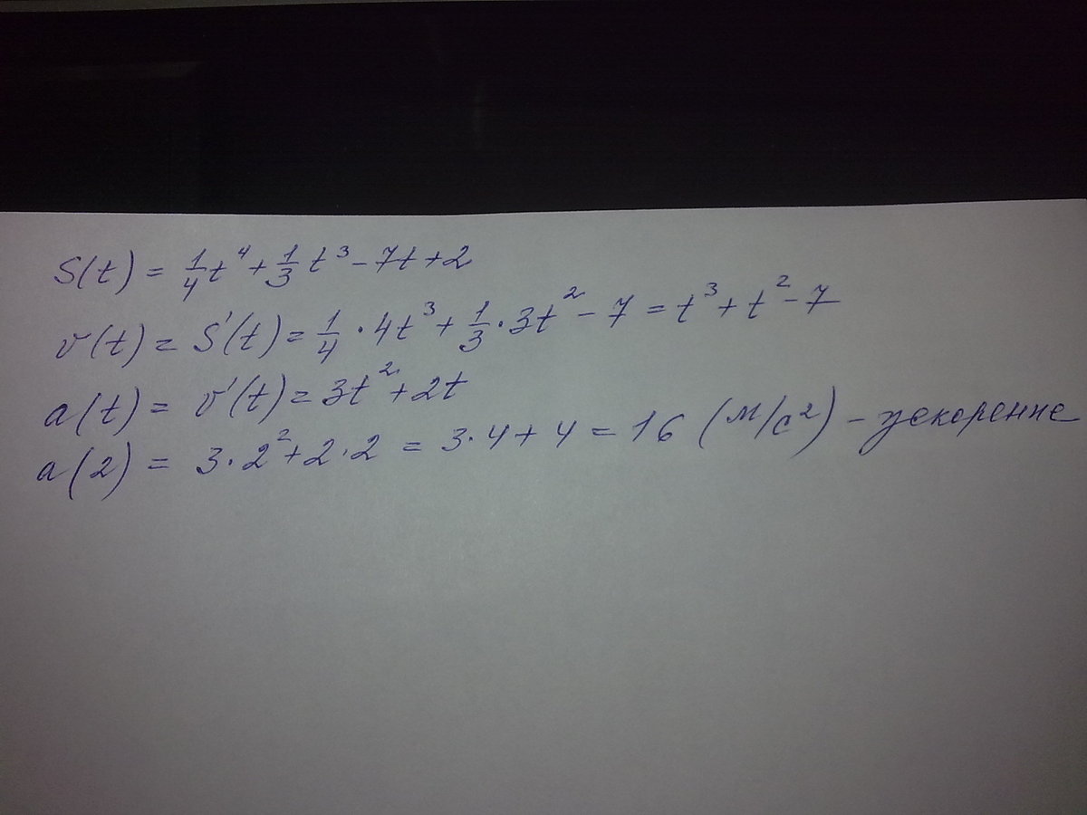 тілр рухається за законом S(t)=1/4t4+1/3t3-7t+2. знайти прискорення через 2 секунди після початку руху