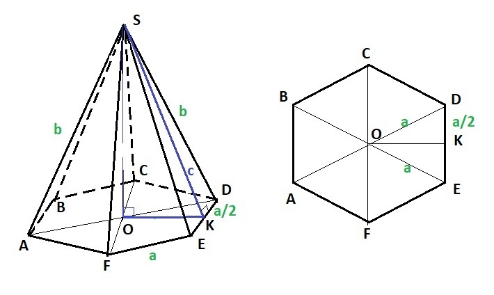 Тогда рассмотрим решение этой задачи в общем случае. Пусть боковые ребра SA=SB=SC=SD=SE=SF=b, стороны основания AB=BC=CD=DE=EF=AF=a.